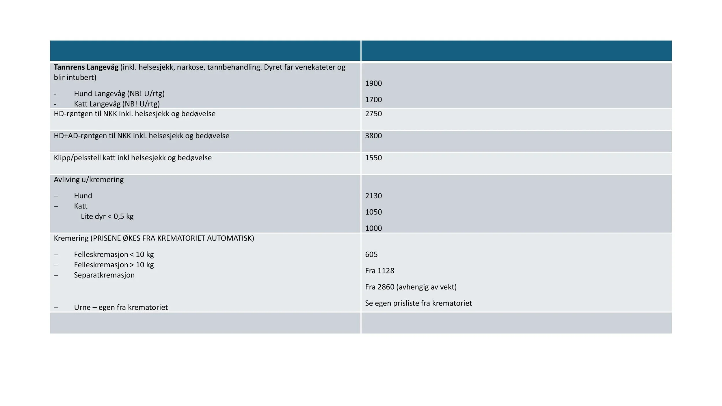 Dette er en prisliste for de vanligste og standardiserte behandlingene vi gjennomfører. Dersom du ikke finner pris på ønsket tjeneste – kontakt oss for et pristilbud. Dersom det er snakk om større utredninger, operasjoner, tanntrekk osv., så gir vi pristilbud på forhånd for avtalte undersøkelser og behandlinger. Dersom det skulle oppstå videre kostnader så avtales dette videre med kunde.
